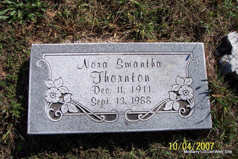| THORNTON, Nora Samantha (LASITER) | Dec. 11, 1911 | Sept. 13, 1988 | Research Note: SSDI gives her last residence as Nevada, Vernon Co., MO. Daughter of Albert Preston Lasiter and Zilpha S. Butler. Zilpha is buried at Hilton Cemetery under Lasiter. - 1940 Census, Washington, Stone, Missouri - Zilpha Lasiter, head, age 60, born MO; Nora Thornton, daughter, age 28, divorced, born MO; Donald Thornton, grandson, age 6, born MO; Bonnie L. Thornton, age 3, granddaughter, born MO. | Census Phyllis Long Photo Diana Cope |