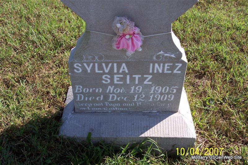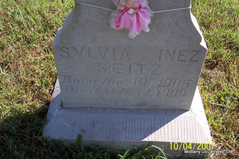 | SEITZ, Sylvia Inez | Nov. 19, 1905 | Dec. 12, 1909 | Research Note: She was a daughter of Joseph J. and Mary Virginia (Hilton) Seitz. - Another Photo | Note Phyllis Long Photos Diana Cope |