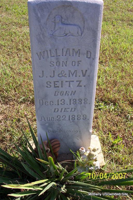 | SEITZ, William D. | Dec. 13, 1888 | Aug. 22, 1889 | Inscription: "Son of J. J. and M. V." - Research Note: Son of Joseph J. and Mary Virginia (Hilton) Seitz. | Note Phyllis Long Photo Diana Cope |