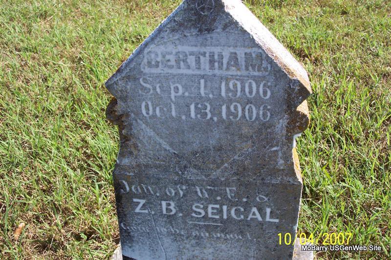 | SEIGEL, Bertham | Sept. 1, 1906 | Oct. 13, 1906 | Inscription: "Son of W. E. and Z. B. Seigel" | Photo Diana Cope |