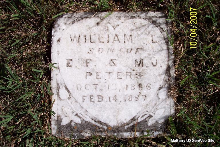 | PETERS, William L. | Oct. 13, 1886 | Feb. 14, 1887 | Inscription: "Son of E. F. and M. J." - Research Note: Son of Enos Franklin Peters and Martha Jane Redding. | Census Phyllis Long Photo Diana Cope |