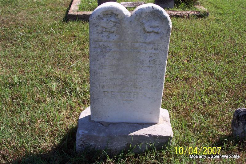 | PETERS, Lyda N. | No Date | Oct. 12, 1885 | SSW: Infant - Inscription: "Children of John B. and Lucinda - Aged 1 Yr and 8 Mos." - Research Note: Daughter of John B. Peters and Lucinda Harbert. | Note Donna Cooper Photo Diana Cope |