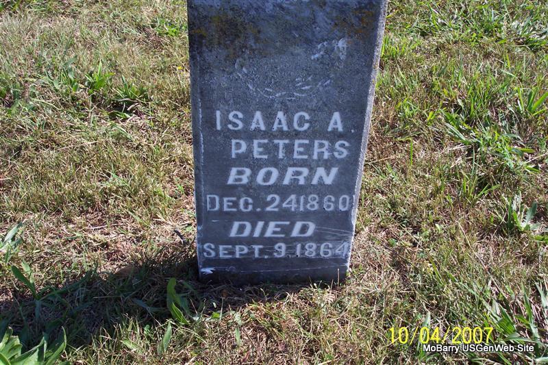 | PETERS, Isaac A. | Dec. 24, 1860 | Sept. 9, 1864 | Research Note: His father was Alfred Peters and his mother was Eleanor Hilton. | Note Donna Cooper Photo Diana Cope |
