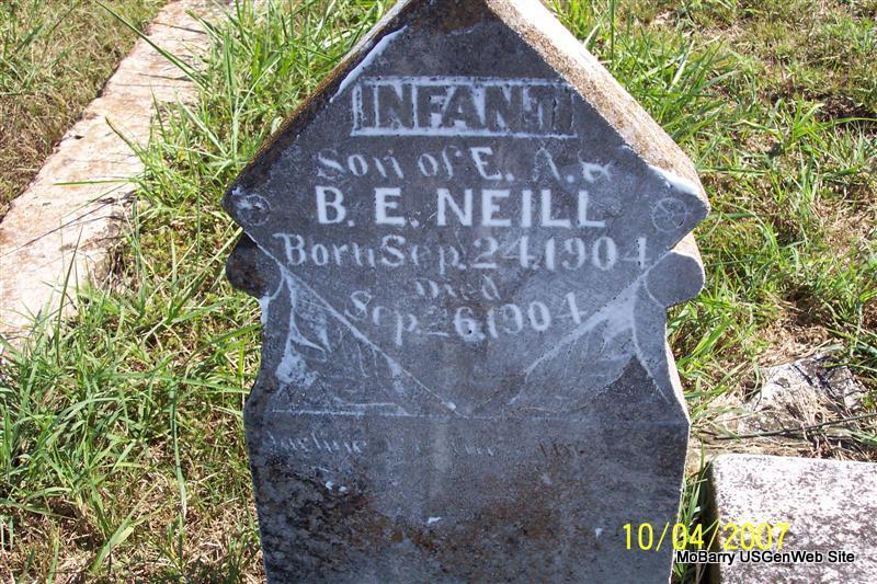 | NEILL, Infant | Sept. 24, 1904 | Sept. 26, 1904 | Inscription: "Son of E. A. and B. E. Neill" - Research Note: Elmer Allen Neill was married to Tabitha "Bitha" E. Hemphill. Tabitha's mother was a Hilton. - Neill Graves | Note Donna Cooper Photos Diana Cope |