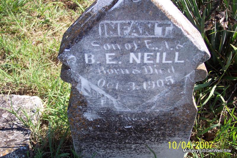 | NEILL, Infant | Oct. 3, 1905 | Oct. 3, 1905 | Inscription: "Son of E. A. and B. E. Neill" - Research Note: Elmer Allen Neill was married to Tabitha "Bitha" E. Hemphill. Tabitha's mother was a Hilton. - Neill Graves | Note Donna Cooper Photos Diana Cope |