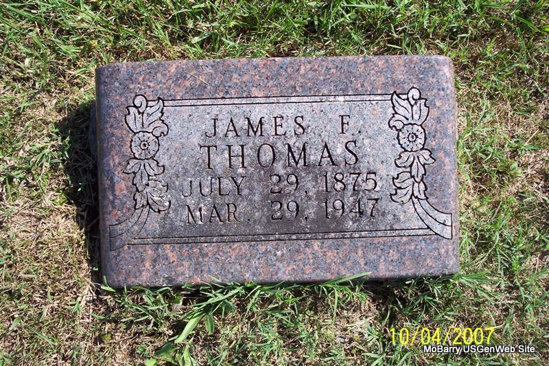 | THOMAS, James F. | July 29, 1875 | Mar. 29, 1947 | Research Note: Son of David Stephen Thomas and Martha Hilton. Still living at home with parents, age 34, single, in the 1910 Census. | Census Phyllis Long Photo Diana Cope |