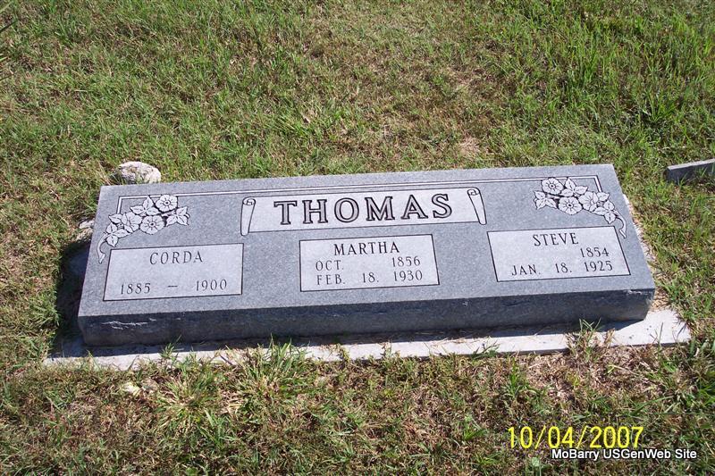 SSW: Corda and Steve - Research Note: Daughter of James Hilton and Adeline Walker, both born VA. She was widowed at the time of her death. James Thomas of Crane, MO was the informant on the death certificate. - Stephen Thomas married Martha Hilton on Aug. 11, 1874 in Barry Co., MO. | Death Certificate MO Marriage Records Phyllis Long Photo Diana Cope |