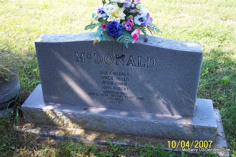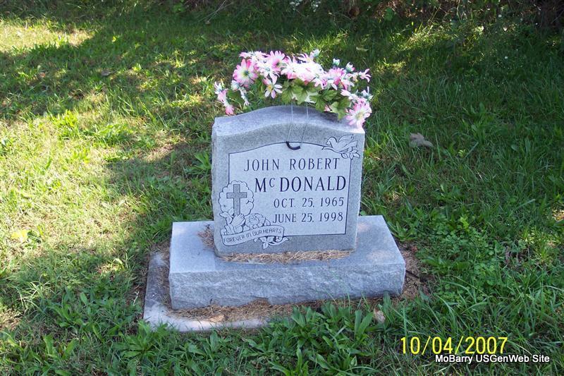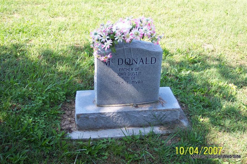 | MCDONALD, John Robert | Oct. 25, 1965 | June 25, 1998 | Research Note: He was a son of Jack and Myra. - Back of stone | Note Photo Diana Cope |