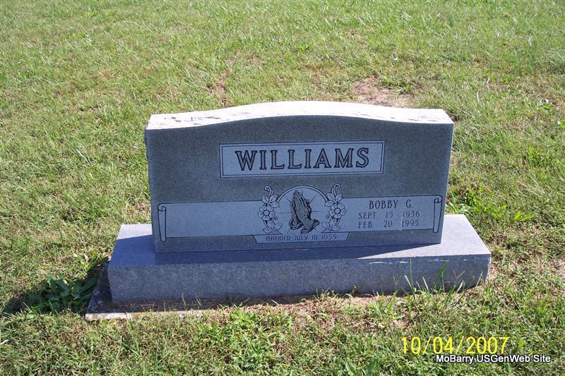 | WILLIAMS, Bobby G. | Sept. 15, 1956 | Feb. 20, 1995 | Inscription: "Married July 10, 1959" - Back of Stone | Photos Diana Cope |
