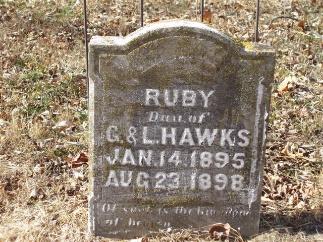 | HAWKS, Ruby | Jan. 14, 1895 | Aug. 23, 1898 | Inscription: "Dau. of G. and L. Hawks | Headstone Roger Longley - Deceased Photo Ralph and Betty Lamberson |