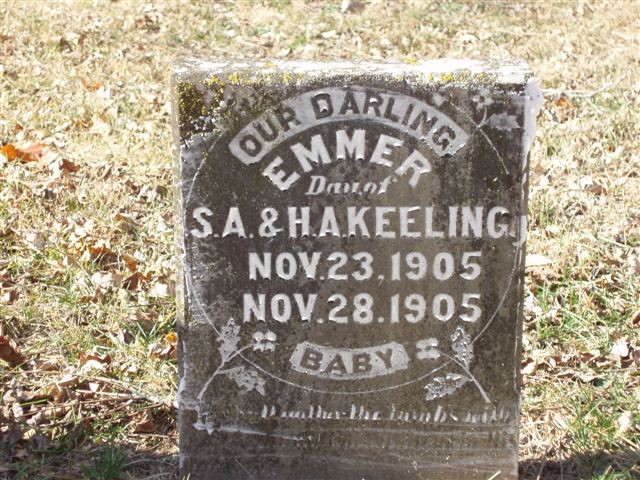 | KEELING, Emmer | Nov. 23, 1905 | Nov. 28, 1905 | Inscription: "Dau. of S. A. and H. A. Keeling" | Headstone Roger Longley - Deceased Photo Ralph and Betty Lamberson |