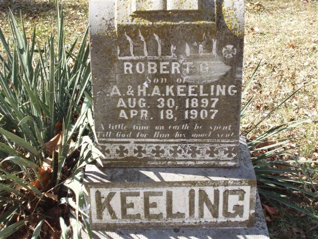 | KEELING, Robert G. | Aug. 30, 1897 | Apr. 18, 1907 | Inscription: "Son of S. A. and H. A. Keeling" | Headstone Roger Longley - Deceased Photo Ralph and Betty Lamberson |