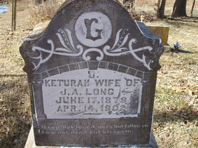 | LONG, Keturah "Katie" (OVERTON) | June 17, 1879 | Apr. 14, 1902 | Inscription: "Wife of J. A. Long" - Research Note: 1900 Census, Shoal Creek Township, Barry County, Missouri - James A. Long, born June 1869 TN, age 30, married 2 years, father born TN, mother TN; Keturah, wife, born June 1879 MO, age 20, married 2 years. - James A. Long, age 23, married Keturah Overton, age 19, on Oct. 13, 1898. She was the daughter of Robert Carter Overton and Sarah Ellen Rodgers. | Census MO Marriage Records Phyllis Long Headstone Roger Longley - Deceased Photo Ralph and Betty Lamberson |
