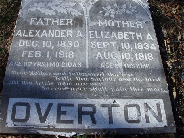 SSW: Elizabeth A. - Inscription: "FATHER" - "Age 87 yr, 1mo, 21dys" - Research Note: His full name was Abdon Alexander Independence Overton. He married Elizabeth A. Pace on Nov. 17, 1851 in Rusk Co., TX. Son of Jesse Overton and Susanna Alexander. - February 7, 1918, Cassville Republican - Dr. A. A. Overton Dead - Dr. A. A. Overton passed away Friday, Feb. 1, at his home on Shoal Creek at the age of 86 years. His death was a result of paralysis and old age. He has been quite feeble for sometime. A stroke of paralysis about three weeks before his death proved too much for his advanced age. He leaves a widow and eight children, two daughters and six sons. He was the father of Dr. R. C. Overton of Shoal Creek (probably named after Alexander's brother, Robert Carter Overton). - Directory of Deceased American Physicians: Abdon Alexander was an Allopath. Practice Places: Purdy, MO on Nov. 22, 1911 and Corsicana, MO on Sept. 29, 1913. Medical School: Tulane University School of Medicine at New Orleans, LA. | Online Obit Notes Phyllis Long Headstone Roger Longley - Deceased Photo Ralph and Betty Lamberson |