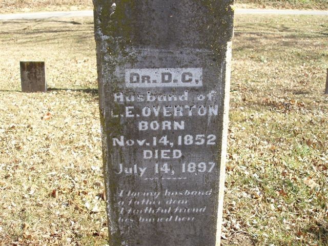 Inscription: "Husband of L. E. Overton" - Research Note: Marriage license reads that he married Louisa Emma Lecompte. - Goodspeed's 1888 History - Dr. D. C. Overton, a physician of Barry Co., MO, was born in Texas in Nov. 1852. He is the oldest child of Robert C. and Amanda (Pace) Overton, natives of TN and GA, respectively. R. C. Overton was born in 1832, and is now residing in Barry Co., MO, engaged in farming. When a young man he went to TX, where he married, coming to Barry Co. when the subject of this sketch was 14 years old. His wife was born in 1837. They are the parents of 12 children, 10 of whom are living. Dr. D. C. Overton attended the common schools of Barry Co. and Clark's Academy at Berryville, AR, graduating from the latter in 1871. Returning home he studied medicine privately for 2 years, after which he entered the University of Nashville, in which he completed his literary education. He next entered the Nashville University of Medicine, from which he received the degree of M. D. in 1874. He then entered the Vanderbilt University of Medicine at Nashville, from which he also took the degree of M. D. in 1875, at which time the first course of lectures delivered in this institution was completed. After having thus finished his professional education, he returned to his home in Barry Co. and practiced medicine for 2 years. April 8, 1877, Dr. Overton was united in marriage with Louiza Emma Lecompte, who was born in Macon Co., MO in 1857 and who is of French origin. He then went to TX, remaining in the eastern part of that State, and practiced his profession for 6 years, when he came back to Barry Co. To our subject have been born 4 children, 2 deceased, unnamed, and 2 living, Arabel and Rollin. Politically Dr. Overton is a Democrat. The family inclination seems to tend toward the medical profession, the subject having 2 brothers and 3 uncles who are physicians. | MO Marriage Records Beverly Matthews - Deceased Goodspeed Phyllis Long Headstone Roger Longley - Deceased Photo Ralph and Betty Lamberson |