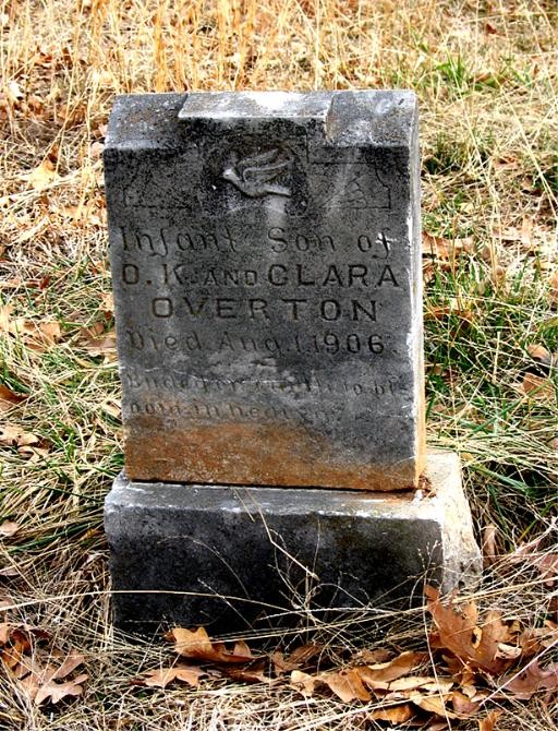 | OVERTON, Infant Son | No Date | Aug. 1, 1906 | Inscription: "Infant Son of O. K. and Clara Overton" - Research Note: Clara McNatt, age 16, married O'Connor K. Overton, age 19, on June 11, 1896 in Barry Co., MO. | MO Marriage Records Phyllis Long Headstone Roger Longley - Deceased Photo Ralph and Betty Lamberson |
