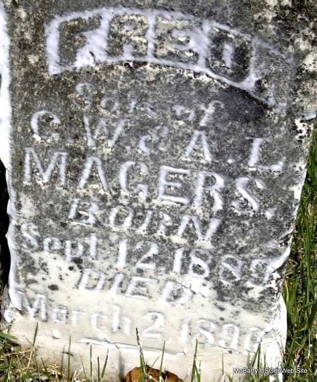 | MAGERS, Fred | Sept. 12, 1889 | Mar. 2, 1890 | Inscription: "Son of C. W. and A. L." | Photo Darla Marbut |