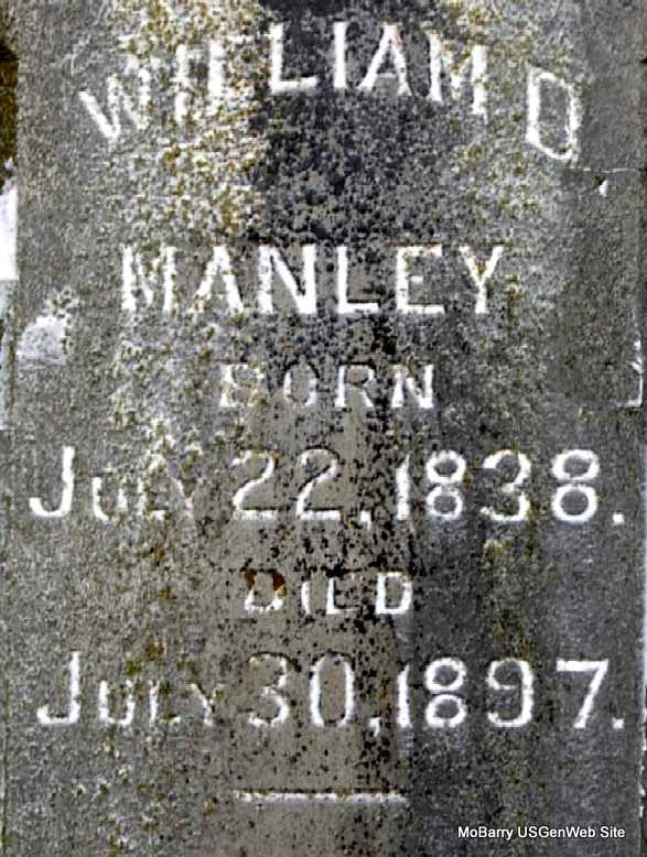 Inscription: "Father Has Gone Home" - Research Note: Civil War Veteran. He married first Mary Elizabeth Bender, second Margaret Ann Bradley on Nov. 5, 1874 in Barry Co., MO, and third Eliza Anna (Flaherty) Johnson, widow of F. G. Johnson. William D. Manley, age 58, married Anna Johnson, age 47, on May 2, 1897 in Cassville, Barry Co., MO. Eliza is buried at Mano Cemetery. - Cassville Republican, August 12, 1897 - The Mayor Dead: Cassville was considerably startled Saturday morning to hear that the Mayor W. D. Manley, had died, very suddenly at 10 o'clock the night before of heart failure after an illness of twenty minutes. The news was the more exciting because the day before, he had been apparently in his usual health and had presided over a case tried before him. Friday night about 10 o'clock he was sitting on his porch enjoying the fresh air, when the fatal stoke fell. Although a doctor was immediately summoned, it was too late. W. D. Manley was born in Medline Co., Oh., June 22, 1838, but his parents moved to Fulton Co., Ind., two years later, and in 1852 to Richland Co., Wis. In 1858 he started for Texas and on his way was stopped a few months in Hickory Co., MO, thence going to Denton, Tex. The following year he went to Ft. Smith, Ark., thence to where Hackett, Arkansas now is, where he married Miss Elizabeth Bender. In June 1862 he came to Cassville, but later went to Wisconsin, and until his return to Cassville in 1867 was in Illinois, Missouri and Arkansas. In 1870, Squire Manly was elected justice of the peace and was serving his fifth term at the time of his decease. In 1894 he was elected mayor and was re-elected June 19, last to fill vacancy. In 1872 he professed religion at Horner Church and was one of the charter members of the First Baptist Church of Cassville upon its organization. The remains were interred with Masonic honors in Horner Cemetery, Saturday, by the side of his first and second wives and children. He was the father of fourteen children, nine of who survive him. Quite recently he was re-married. - Goodspeed's History - W. D. Manley, J. J. Wallen and W. C. Hawk were poor farm commissioners in 1880. - William D. Manley, justice of the peace, notary public, and pension insurance and land agent, of Cassville, MO is a native of Medina Co., OH. He was born in 1838, and is the son Menzies S. and Minerva (Sippy) Manley. His father was of English descent, was born in CT in 1805, and was a farmer by occupation. After his marriage he removed to Medina Co., OH, and thence, in 1840, to Fulton Co., IN. He resided there until 1852, when he went to Richland Co., WI, where he died ten years later. His wife, nee Minerva Sippy, was of French descent. She was born in PA in 1815, and is now living in Sanborn, O'brien Co., IA. She was the second wife of Mr. Manley, and is the mother of four children, of whom William D. is the second. Our subject remained with his parents until twenty years of age, when he removed to the "Lone Star" state, where he went to work upon a farm. The next year he went to Sebastian Co., AR, where in 1861 he married Mary E. Bender, who was born in that county in 1844. In June, 1862, Mr. Manley entered the employ of the United States Government, and was sent to MO. In 1867 he located in Barry Co., one and one-half miles south of east of Cassville. In 1870 he was elected justice of the peace, which office he has since held continuously, and has administered its duties with good judgment and uncompromising integrity, as his long term of service testifies. On Mar. 8, 1887, he was commissioned a notary public, and a year later was appointed pension agent. He has also engaged in the insurance business. Since 1871 he has been a resident of Cassville. Mr. Manley has been twice married. His first wife died in Aug. 1876, leaving four children: Charles, John W., Alice and Irene I., and in Dec. 1877, he was united in marriage to Margaret Bradley, who was born in Barry Co., MO in 1848. They have five children: Rosa, Pearl, Burl, Bonnie, and George. Mr. Manley is a Democrat in politics, and he is a member of the Masonic fraternity and the Baptist Church. His wife is also a member of the Baptist Church. | Goodspeed MO Marriage Records Phyllis Long Online Obit Photo Darla Marbut |