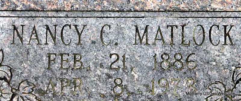 | MATLOCK, Nancy Cornelia (TOWLER) (GARRETT) | Feb. 21, 1886 | Apr. 8, 1973 | Research Note: Daughter of Elisha Towler and Nancy Jane Pruitt. Married first at age 16, William R. Garrett, age 23. Her father E. Towler gave consent. She second married Preston Matlock. - Cassville Republican, Aug. 7, 1919 - The marriage of Mrs. Cornelia Garrett to Preston Matlock was solemnized by Squire Plattenburg Tuesday evening. They are both highly esteemed citizens of our town. - MO Marriage Records give the marriage date as Sept. 23, 1913. | Online Newspapers MO Marriage Records Phyllis Long Photo Darla Marbut |