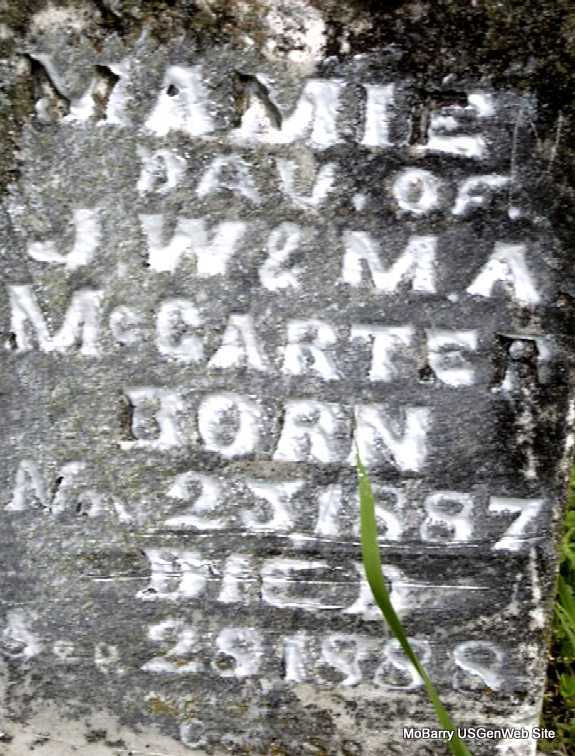 | MCCARTER, Mamie | Nov. 25?, 1887 | Sept. 28, 1888 | Inscription: "Dau. of J. W. and M. A." - Research Note: Daughter of John Wesley and Mary Ann McCarter. | Note Phyllis Long Photo Darla Marbut |