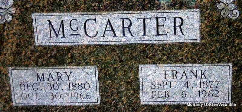 | MCCARTER, Mary Magdaline (MEADOR) | Dec. 30, 1880 | Oct. 30, 1966 | SSW: Frank - Research Note: Mary was a daughter of Eli Wilson and Lurana (Vermillion) Meador. John F. McCarter, age 23, married Mary M. Meador, age 20, on Aug.. 14, 1901 in Barry Co., MO. | MO Marriage Records Census Donna Cooper Photo Darla Marbut |