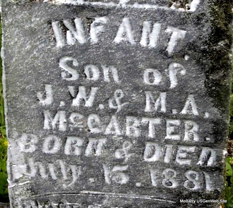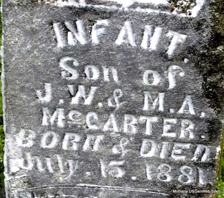 | MCCARTER, Infant | July 15, 1881 | July 15 1881 | Inscription: "Inf. son of J. W. and M.A." - Research Note: Son of John Wesley and Mary Ann McCarter. - Another Photo | Note Phyllis Long Photo Darla Marbut |