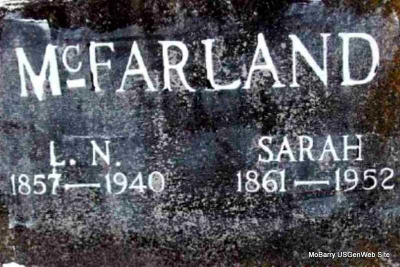 SSW: Sarah - Research Note: His wife was Sarah L. Filmore. Son of George Washington McFarland and Sarah Ann Jennings. - May 18, 1916, Cassville Republican - Personal and Local News: Mr. and Mrs. L. N. McFarland and adopted daughter, south of town, left Thursday for visits in Ohio, Michigan and other states. They will be gone all summer. Upon their return they mean to stock up their farm again, having sold off their stock a few weeks ago. - Cassville Republican Oct. 16, 1919 - Seymour McFarland of Baxter Springs, Kan., arrived last week for a visit with his uncle, L. N. McFarland, southeast of this city. He said that part of Kansas has a good yield of wheat and oats and fair corn this year considering the dry weather. - July 24, 1920, Cassville Democrat - L. N. McFarland went to Joplin Wednesday morning and will visit points in Kansas before returning. His daughter Miss Mary went to Webb City to visit relatives. - August 7, 1920, Cassville Democrat - Nute McFarland a prominent orchardist, southeast of this city, reports a fair crop of apples. He has all varieties. | Online Newspapers Census Phyllis Long Photo Darla Marbut |
