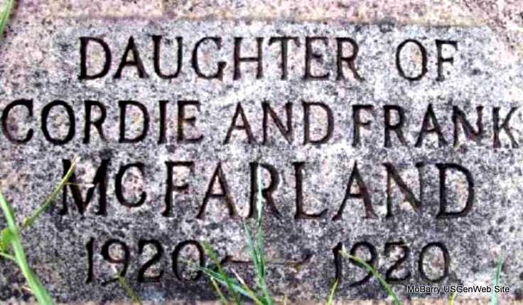 | MCFARLAND, Daughter | 1920 | 1920 | Inscription: "Dau. of Cordie and Frank" - Research Note: Frank McFarland was the son of Lonzo (Alonzo) Newton McFarland and Sarah L. Filmore. KY death certificate gives Frank McFarland, born 1883 and died May 28, 1943 in Fayette Co., KY. His wife was Cordie McFarland, father was A. (Alonzo/Lonzo) N. McFarland, mother Sarah McFarland. | KY Death Certificate Phyllis Long Photo Darla Marbut |