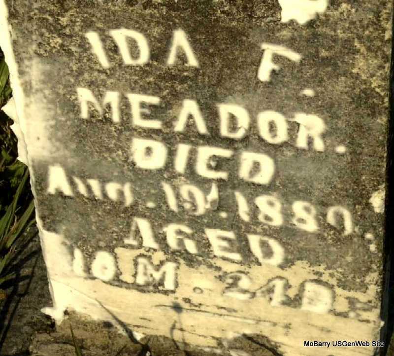 | MEADOR, Ida Florence | Sept. 26, 1879 | Aug. 19, 1880 | Inscription: "Aged 10 mo. 24 days" - Research Note: Daughter of Eli Wilson Meador and Lurana Vermillion. | Note Phyllis Long Photo Darla Marbut |