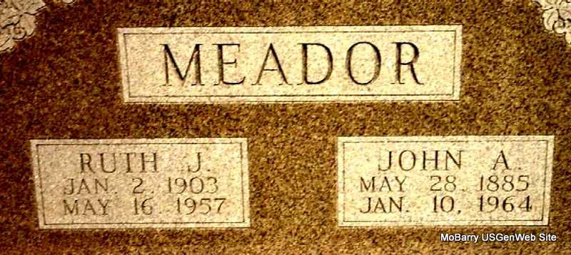 | MEADOR, John A. | May 28, 1885 | Jan. 10, 1964 | SSW: Ruth J. - Research Note: Son of Eli Wilson Meador and Lurana Vermillion. - December 4, 1913, Cassville Republican - John Meador came in Friday night from Denver, Colo., to visit his parents, Mr. and Mrs. E. W. Meador, and other relatives in and about Cassville. - March 2, 1916, Cassville Republican - Personal and Local News: John Meador of New Mexico is in on a visit with his parents, Mr. and Mrs. Wilson Meador, south of this city. | Online Newspapers Census Phyllis Long Photo Darla Marbut |