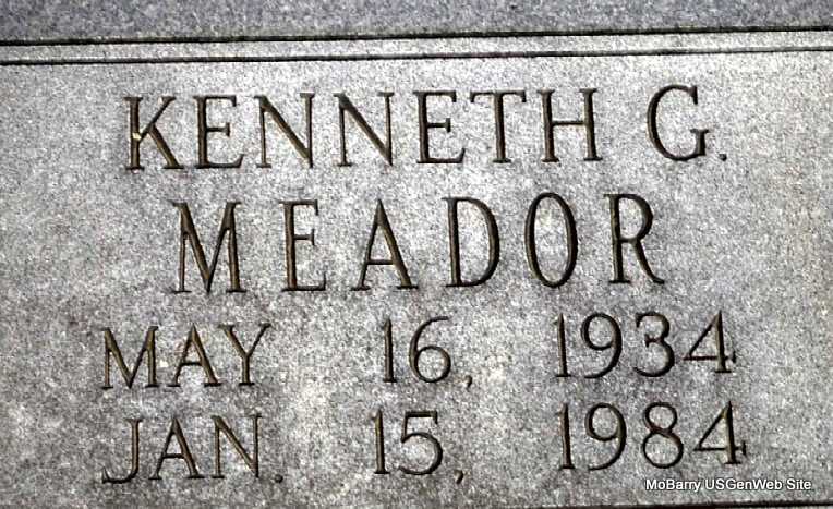Research Note: Son of John A. Meador and Ruth Jane Garrett. He married Naoma Ruth McCoullough on Aug. 1, 1953 in Barry Co., MO. - Kenneth Gaylord Meador, age 49, a resident of Carroll House Apts., Berryville, Arkansas, died Sunday, January 15, 1984 at his home. He was born May 17, 1934 at Cassville, the son of John and Ruth (Garrett) Meador. His parents and one brother Robert, preceded him in death. He was a member of First Baptist Church Penn Memorial in Eureka Springs. He is survived by one sister. | Obit Phyllis Long Photo Darla Marbut |