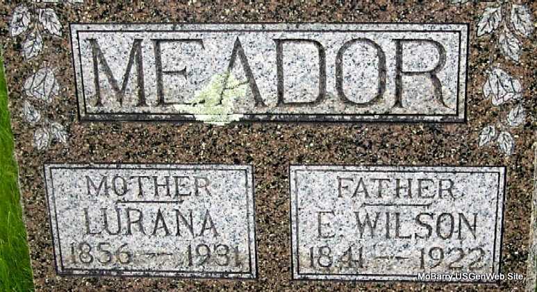 SSW: Lurana - Inscription: "Father" - Research Note: Civil War Veteran. Son of Nathaniel Meador and Catherine Perdue, both born TN. Mrs. Edna Sparkman of Cassville, MO was the informant on the death certificate. Father of 11 children - Samira, Isabel Ida (Reese), Ida Florence, Mary Magdalena (McCarter), Luella Mae, John Logan, Berthena, Edna, George Harrison, Ernest Roland, and Ralph. - February 22, 1908, Cassville Democrat - Married Saturday, night Feb. 15, 1908, by Squire S. B. Feeland, Franz Sparkman and Miss Edna Meador, daughter of Mr. and Mrs. Wilson Meador, residing south of Cassville. - December 4, 1913, Cassville Republican - John Meador came in Friday night from Denver, Colo., to visit his parents, Mr. and Mrs. E. W. Meador, and other relatives in and about Cassville. - March 19, 1914, Cassville Republican - Washburn Prairie News: Mr. and Mrs. Merton Meador visited their uncle, Wilson Meador and family of Horner Sunday. - July 9, 1914, Cassville Republican - E. W. Meador south of town returned Friday from a visit with his daughter, Mrs. Frank Jackson, and family on Shoal Creek. - Cassville Republican, Dec. 5, 1918 - Ernest Meador who is in the military service in France has written his parents south of town, Mr. and Mrs. Wilson Meador, that he had been slightly wounded and in the hospital but would soon be out again. The letter was dated prior to the signing of the Armistice. | Death Certificate Online Newspapers Phyllis Long Photo Darla Marbut |