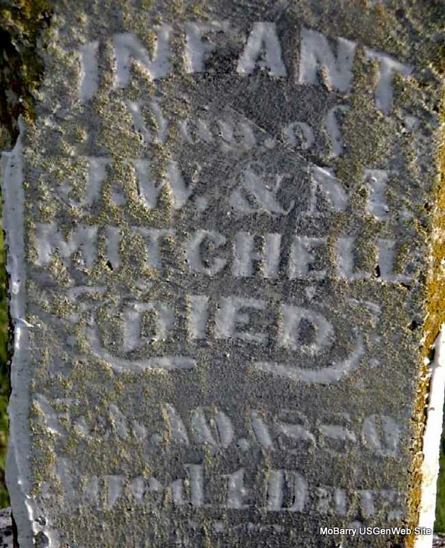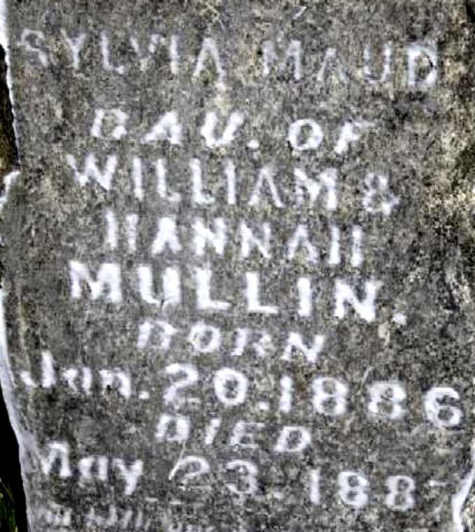 | MULLIN, Sylvia Maud | Jan. 20, 1886 | May 23, 1887 | Inscription: "Dau. of William and Hannah" - Research Note: Daughter of William F. Mullin and Hannah Nickle. | Note Phyllis Long Photo Darla Marbut |