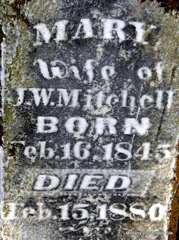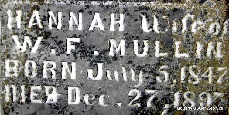 Inscription: "Wife of W. F. Mullin" - Research Note: Daughter of Henry Wilson Nickle and Esther Brown. Sister of Lucy J. (Nickle) Burks buried in Horner Cemetery. She first married Stephen Hammond on Jan. 2, 1866 in Bond Co., IL. Hannah Hammond is in Barry Co., MO in 1880, widowed with 3 children. Must have married second Mr. Parnell as MO Marriage Records have Mrs. Hannah Parnell, married William F. Mullin on Sept. 1883 in Barry Co., MO. - Cassville Republican, Jan. 6, 1898 - Died, Dec. 28 at 9:40 o'clock, Hannah, wife of W. F. Mullin, age 50 yrs, 6 months, 28 days. Mrs. Mullin was born in Gallia Co., Ohio, Jan. 5, 1847. She was in the Christian work since 13 years of age. She first joined the Methodist church and remained in that faith until 7 years ago, when she professed holiness and has been an earnest worker in that case. She has suffered untold pain. Often during her sickness she would exhort her children and neighbors to meet her in heaven, and often sang praises to God for His saving poser., and when she so low that she could not speak then would clap her hands in evidence that she was praising God through hurt fatal illness. The bereaved family have the sympathy of the entire community. God in His wisdom has recalled a boon? of love He's given. Though the body slumbers now the soul is in heaven. A Friend. - March 20, 1890, Cassville Republican - W. F. Mullins and wife are visiting William Barrich, who is a son-in-law of Mrs. Mullins. | Online Obit Census MO marriage Records IL Marriage Records Phyllis Long Photo Darla Marbut |