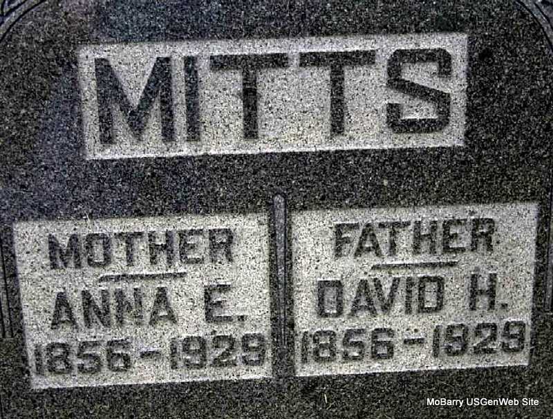 SSW: Anna E. - Inscription: "Father" - Research Note: Son of Squire J. Mitts. His mother was not named on his death certificate. Nova Mitts of Cassville, MO was the informant. - Son of Squire Jefferson Mitts and Nancy Ann Carnes. - Cassville Democrat, March 15, 1929 - DAVID HENRY MITTS DIES LAST SUNDAY MORNING: David Henry Mitts was born in Adams County, Ill., Oct. 7, 1856. Died at his home three miles east of Cassville, Mo., March 10, 1929 age 73 years, five months and three days. He was married to Anna Clingingsmith April 9, 1878. To this union three children were born, who are: Will, Ira and Nova Mitts, all of Cassville. He moved from Illinois when 18 years of age, going to Trenton, Mo., and lived there until 1898, when he came to Barry County, east of Cassville, where he lived until death came. He was converted in 1901 and united with the Christian church at Cassville, where he remained a devoted member until death. He was a kind and devoted husband and loving father, a citizen who had many friends. He will be missed by his family and neighbors. He is survived by his wife, three sons, three brothers, Harvey Mitts, of Trenton, Mo., Tom Mitts of Burton, Ill., and one sister Hannah Brown of California. He also left nine grandchildren and a host of friends to mourn his going. Funeral services were conducted at the Christian church in Cassville, on Monday afternoon, March 11, 1929 by Chas Vanzandt, burial in the Horner Cemetery, under direction of the Hankins Funeral Service. Mr. Mitts had an extensive acquaintance throughout this section where he had resided many years and was a man that stood for honest straight-forward dealings. His word was his bond and all regarded him highly. A few years ago he operated a country store at his home and enjoyed a nice business. He also engaged in farming and was very successful. His estimable wife is an excellent lady and dearly loved by all who know her. His passing is a great loss to this section of the county and the Democrat joins the many friends of the Mitts family in extending sympathy in their said hour of bereavement. Many beautiful floral offerings were received by friends and relatives of the family and splendid music was rendered at the services by Mrs. John Ray, Mrs. Glen Pearl and Chas. Willis and Clint Blythe. | Death Certificate Online Obit Census Phyllis Long Photo Darla Marbut |