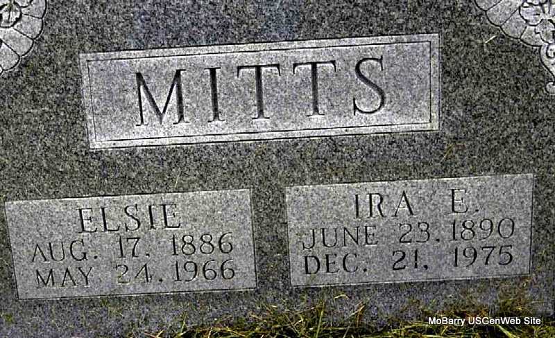 Inscription: "I. E. and Elsie Mitts" Research Note: Her death certificate has her birth date as Apr. 23, 1908. She was a daughter of Ira Everett Mitts and Elsie (Smith) Mitts, both born MO. - Feb. 16, 1911, Cassville Republican - The little three year old daughter of Mr. and Mrs. Ira Mitts east of town died Monday night of diphtheria. The case was under quarantine. | Death Certificate Online Newspapers Phyllis Long Photo Darla Marbut |
