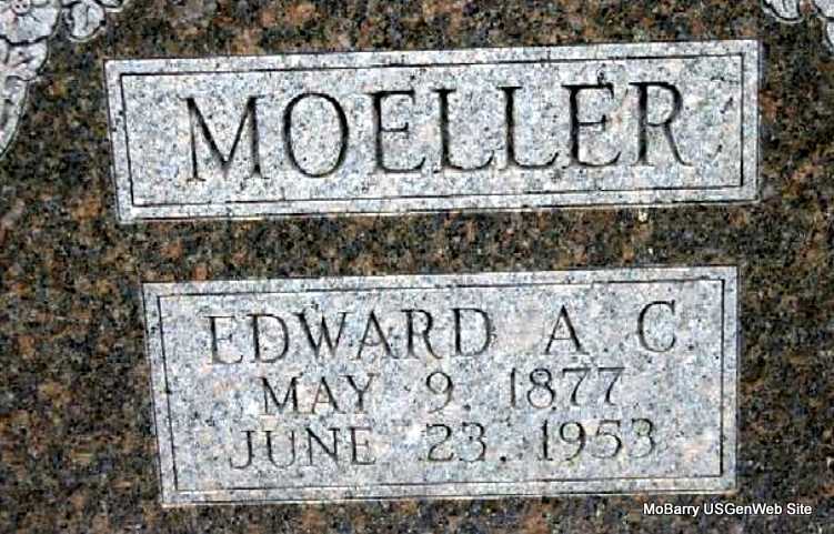 June 23, 1953 | Research Note: Son of John and Elizabeth Moeller, both born Germany. 1900 Census in NE. 1920, he has married Anna and in Pawnee Co., OK. 1930 Edward and Anna are in Prairie, Carroll Co., AR with 9 children. - 1940 Census, Butterfield, Barry, Missouri - E. A. C. Moeller, head, age 63, born NY, lived in Berryville, AR in 1935, farmer; Anna, wife, age 49, born NE; Katie, daughter, age 20, born OK; Mary, daughter, age 15, born OK; W. R., son, age 13, born OK; Carl, son, age 7, born OK. | Census Phyllis Long Photo Darla Marbut |