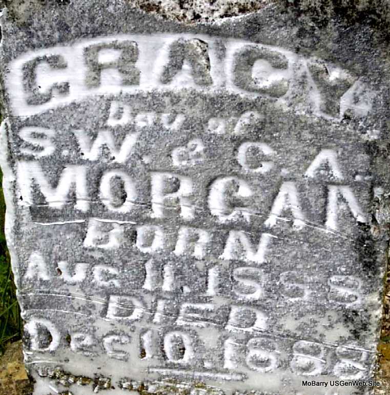 | MORGAN, Gracy | Aug. 11, 1888 | Dec. 10, 1888 | Inscription: "Dau. of S. W. and C. A." | Photo Darla Marbut |