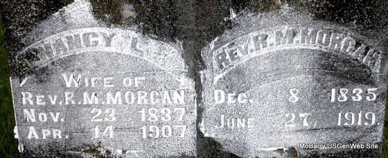 SSW: Nancy L. - Research Note: Son of Peter Morgan and Nancy Crosley. Peter second married Harriett Jane (Varner) Shipley. Mother not named on the death certificate. R. A. Morgan of Seneca, MO was the informant. - Cassville Republican, July 3, 1919 - Rev. Morgan Dies At Seneca: Rev. R. M. Morgan for years administer of the Gospel in this county, died Friday, June 27, at the home of his son, Richard, in Seneca from old age and general debility. His body was brought to this city Saturday evening and taken to the home of his daughter, Mrs. D. L. Cox. The funeral, conducted by Rev. J. T. Brattin, was held Sunday afternoon at the Horner Baptist church of which Rev. Morgan was a member for many years. Interment was made in the Horner cemetery. Richard Marion Morgan was born in Indiana Dec. 8, 1835. He came with his parents to Missouri when he was five years old. The family located in McDonald County and there R. M. grew to manhood. In about 1867 he moved to this county which was his home for many years. Some fifteen years ago he moved to Newton County. He was converted when in his teens and about 40 years or more ago was ordained as a Baptist minister. He was a man loved and respected by all who knew him and lived a devoted Christian life until called into eternal rest. He was married to Miss Lucinda Brady, Feb. 4, 1855. She died April 14, 1907. To them twelve children were born, three daughters and nine sons, of whom one daughter, Mrs. D. L. Cox, of Cassville and five sons are living. The sons are C. A., S. W. and R. A. of Seneca; W. E. of Kerwin, Kan., and J. L. of Washington, Neb. - August 19, 1915, Cassville Republican - Personal and Local News: R. M. Morgan of Newton County and William Morgan of Temple, Tex., spent last week in this vicinity on a visit. They are brothers and had not seen each other for years. | Death Certificate Online Newspapers Census Phyllis Long Photo Darla Marbut |