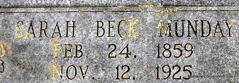 | MUNDAY, Sarah (BECK) (JOSEPH) | Feb. 24, 1859 | Nov. 12, 1925 | Research Note: Sarah was the daughter of Daniel Beck and Louise Samantha Redman. She first married Francis Marion Joseph and second, Christopher H. Munday, buried at Mano Cemetery. | Census Phyllis Long Photo Darla Marbut |