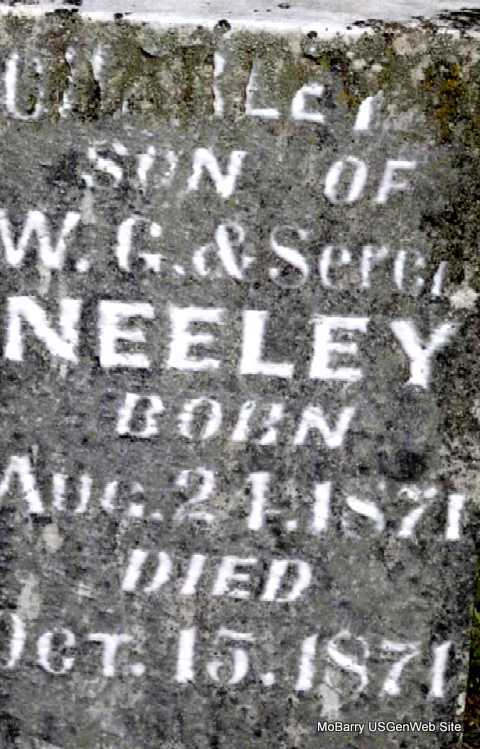 | NEELEY, Charley H. | Aug. 24, 1871 | Oct. 15, 1871 | Inscription: "Son of W. G. and Serena" - Research Note: Son of William Garrett and Serena Belle Horner. | Note Phyllis Long Photo Darla Marbut |