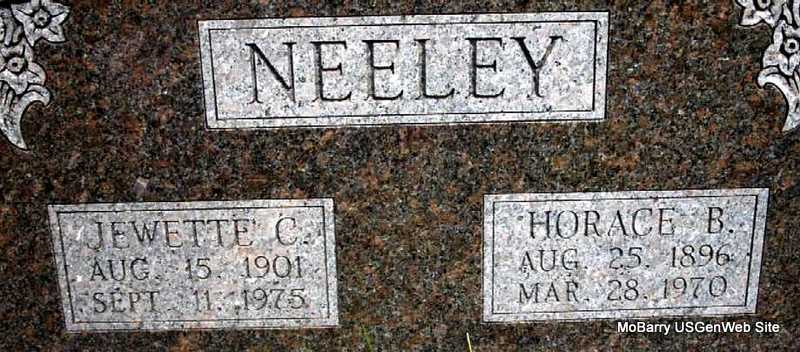 | NEELEY, Jewette Cleo (REAMS) | Aug. 15, 1901 | Sept. 11, 1975 | SSW: Horace B. - Research Note: Daughter of George Washington Reams and Minerva Isabelle Hefley, both buried at Horner Cemetery. | Census Phyllis Long Photo Darla Marbut |