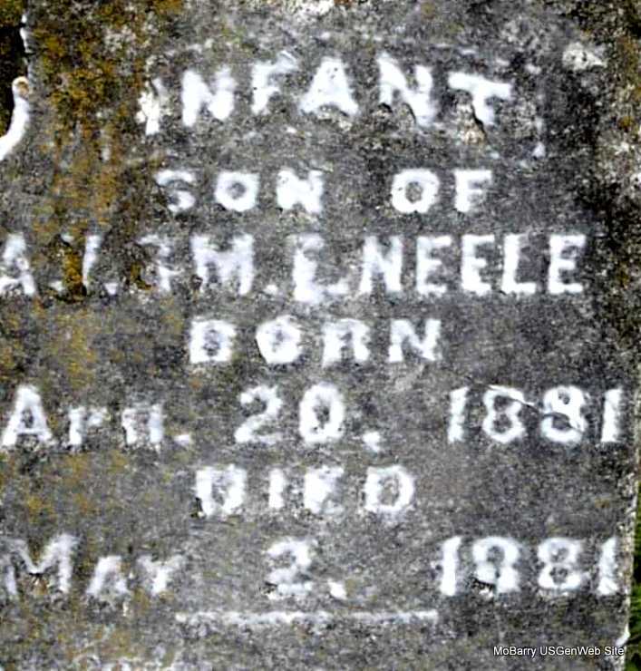 | NEELEY, Infant | Apr. 20, 1881 | May 2, 1881 | Inscription: "Infant Son of A. V. and M. E." - Research Note: Son of Abner V. Neeley, Jr. and Mary Ellen Fare. | Note Phyllis Long Photo Darla Marbut |