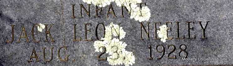 | NEELEY, Jack Leon | Aug. 23, 1928 | Aug. 23, 1928 | Inscription: "Infant of Jack and Mary" - Research Note: Son of Jack Neeley and Mary Elsie Hewig. Jack Sr. was the son of William A. and Nellie G. Neeley. |