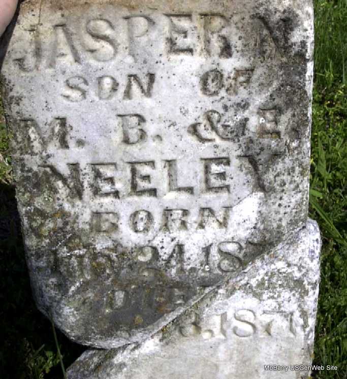 | NEELEY, Jasper N. | July 24, 1870 | __ 3, 1871 | Inscription: "Son of M. B. and E." - Research Note: Son of Milton B. and Elizabeth Neeley. | Note Phyllis Long Photo Darla Marbut |