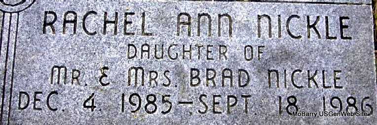 | NICKLE, Rachel Ann | Dec. 4, 1985 | Sept. 18, 1986 | Inscription: "Daughter of Mr. and Mrs. Brad Nickle" | Photo Darla Marbut |