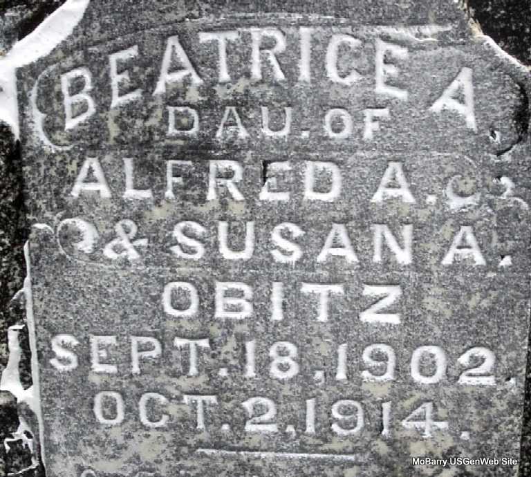 | OBITZ, BEATRICE A. | Sept. 18, 1902 | Oct. 2, 1914 Barry Co., MO |