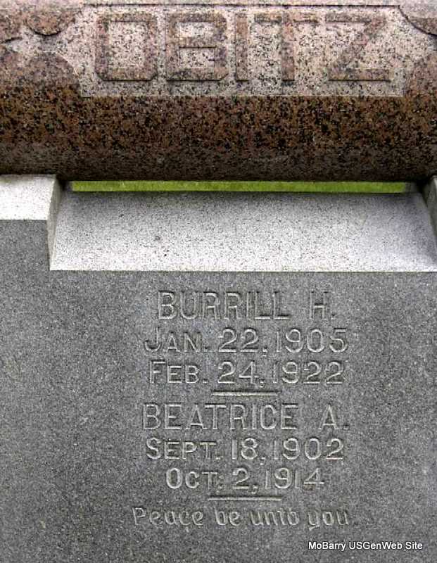 | OBITZ, Burrill H. | Jan. 22, 1905 | Feb. 24, 1922 | SSW: Beatrice A. - Inscription: "Peace Be Unto You" - Research Note: Son of Alfred Obitz and Susan Alice Kieth. | Note Phyllis Long Photo Darla Marbut |