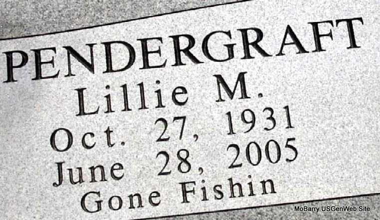 Inscription: "Gone Fishin" - Research Note: She was a daughter of Grover C. and Smithie L. (Hilburn) Beck. Children were James Price, Sheila K. Lloyd, Celia Faye Robbins, Karen Sue Robbins, and Lucinda M. Patterson. She was a cook at various restaurants and attended Mt. Zion Church. She married Robert L. Pendergraft on November 15, 1982, and he preceded her in death October 12, 1990. She was preceded in death by four brothers and one sister. | Granddaughter Rebecca Smith Fohn Funeral Home Phyllis Long Photo Darla Marbut |