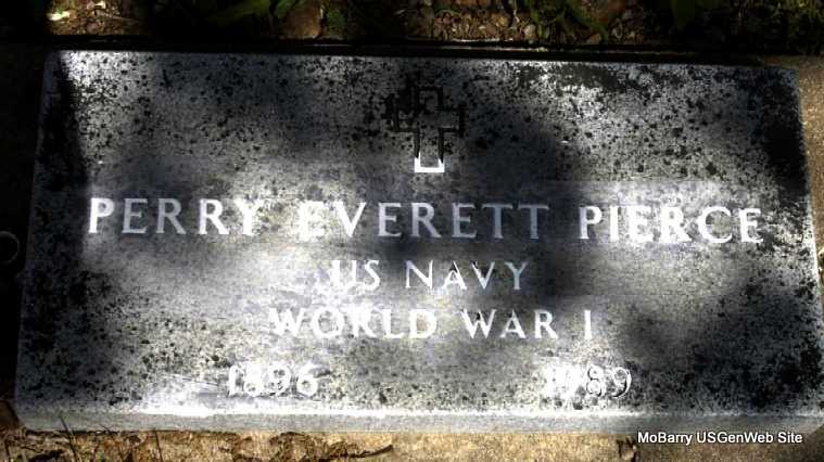 Inscription: "US NAVY WORLD WAR I" - Research Note: SSDI gives his last residence as Branson, Taney Co., MO. WW I registration card says his father was born in NY, NY. He was living in Kansas City MO and working at Hohn Mfg. Co. His nearest relative was D. C. Pierce of Fort Adams, RI. - 1940 Census, Corsicana, Barry, Missouri - Perry Pierce, head, age 43, born MO, lived in Newton Co., MO in 1935, farmer; Gladys, wife, age 30, born MO; Margaret, daughter, age 9, born MO. | SSDI Census WW I Reg. Phyllis Long Photo Darla Marbut |